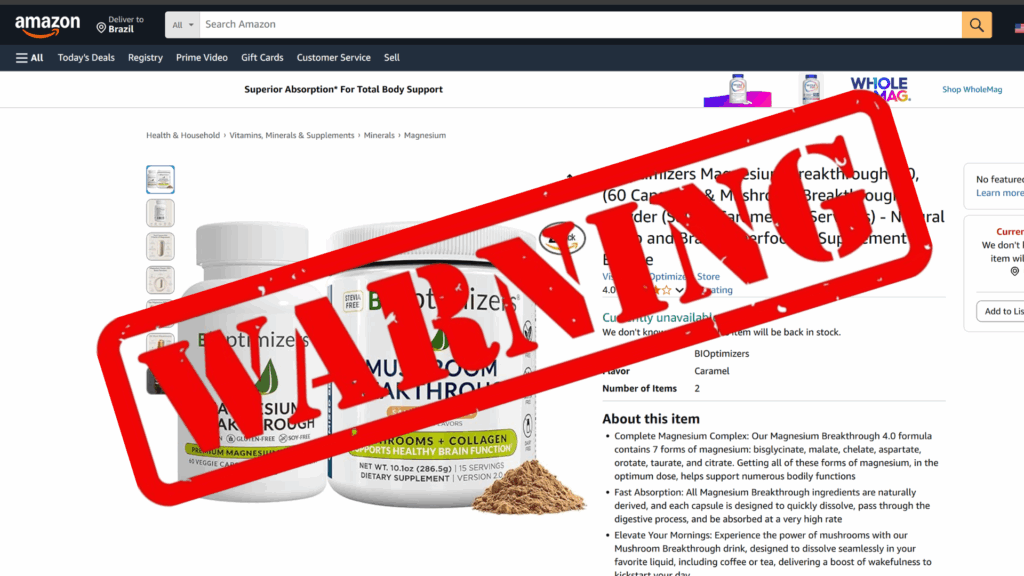 We strongly advise against ordering Magnesium Breakthrough from Amazon, Walmart, eBay or Walgreens, as these sources often sell fake versions with entirely different ingredients, which can be very dangerous.